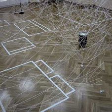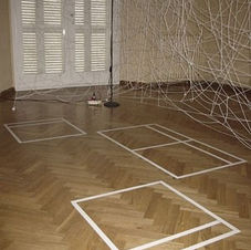 El procedimiento de realización de la instalación se basa en la disposición sobre el suelo de la sala, de una retícula de distribución de las estancias siguiendo el modelo que se usa a la hora de proyectar un plano arquitectónico , con sus códigos a la hora de representar los diferentes sentidos de cada estancia, con sus particularidades propias: sus muebles, aperturas de puertas, distribución etc. Sobre este plano se edifican tabiques a través de una cuerda, cada tabique es una cuerda que configura el espacio. Es a través de la cuerda que se configura y dota sentido a el espacio. Esta actúa como hilo conductor que nos acompaña, guiándonos como el joven Teseo fue guiado por el hilo de Ariadna para vencer al laberinto, conectando nuestro interior, nuestras memorias, deseos, heridas, anhelos, con la propia necesidad de expresarnos, configurándonos individualmente. Cada recuerdo un nudo, cada vivencia otro, así sucesivamente hasta crear una red que nos atrapa pero que también nos protege, tejiendo nuestra propia construcción de identidad. La colocación de una luz estroboscópica confiere a la instalación de un aire crepuscular, flashes que nos inundan nuestra memoria con recuerdos de lo que fuimos, somos y quizás nunca seremos. Luces que se instalan en nuestro cerebro para ser guiados como cualquier Ícaro con sus alas relucientes hacía un sol infinito.